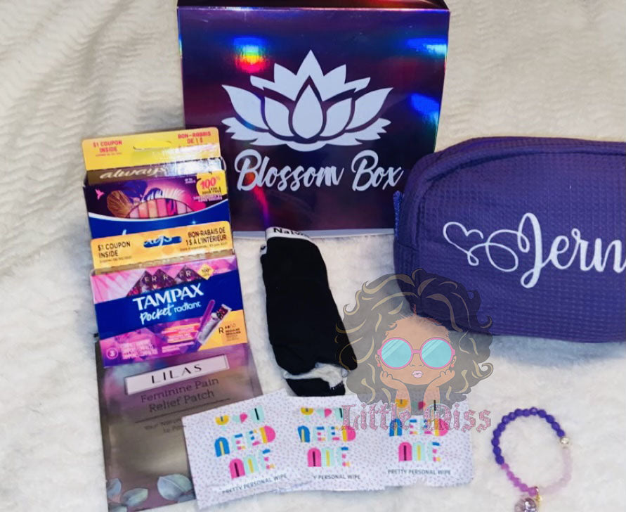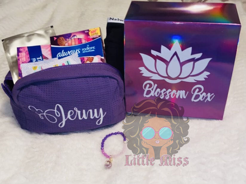 Blossom Box is a starter kit for a girl's first menstrual cycle. Colors of bags available are purple, orange, red, and pink.