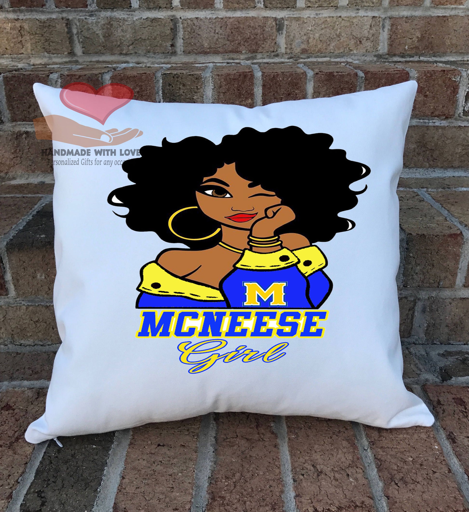 Show some school spirit with this college girl throw pillow. It would look great in the new college student's dorm room. Pillow can be personalized with any college. Pair it with the Student planner, wall clock and the college girl tumbler to make a great gift set for a high school graduated on their way to college!