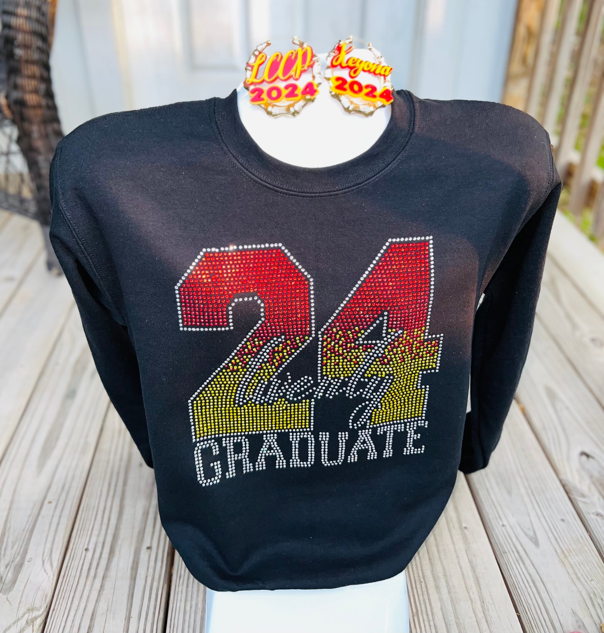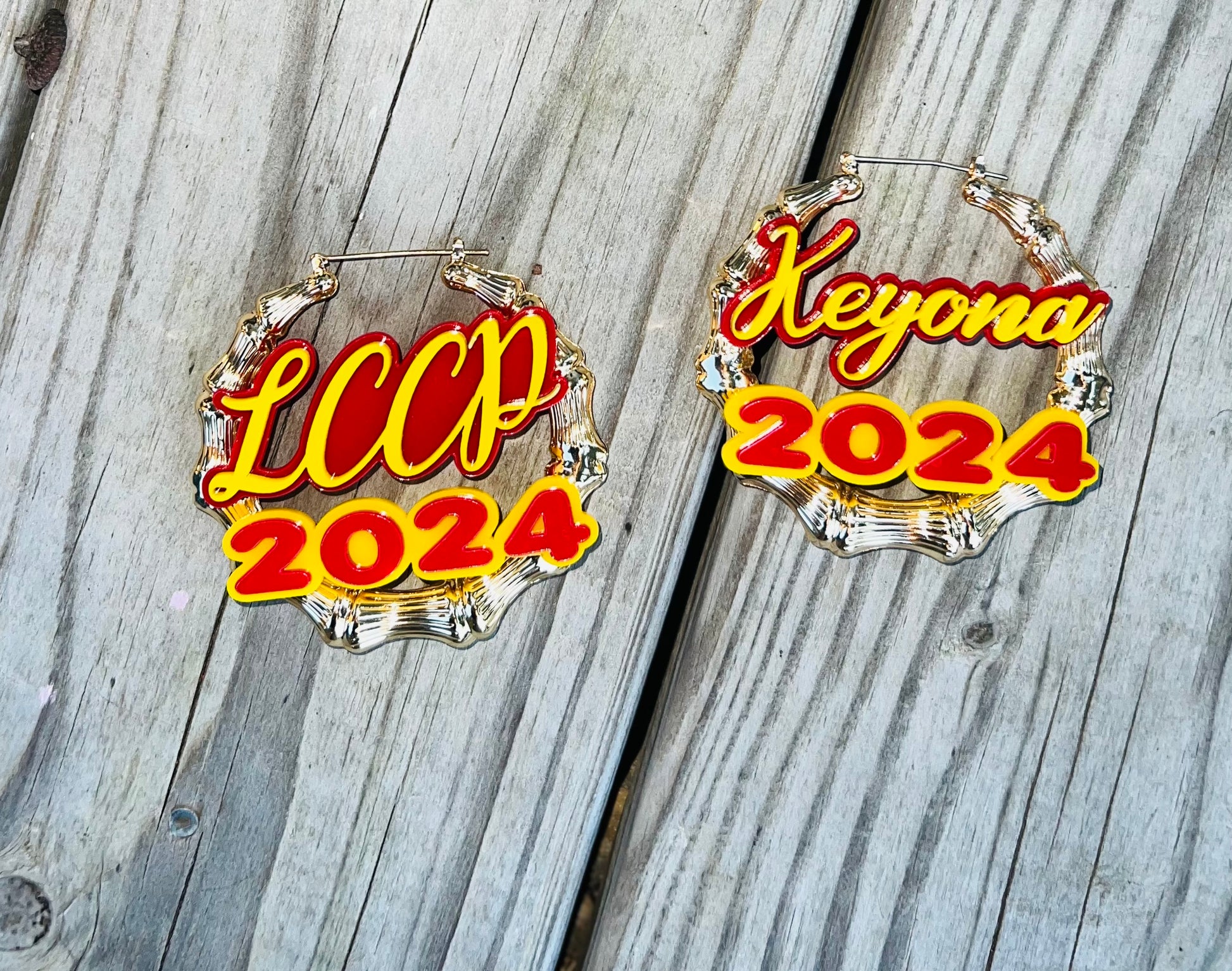 Show your school spirit with these custom bamboo earrings. Available in medium (approx 2") and large (approx 3" shown) sizes and gold and silver colors. These earrings make a great addition to any graduate photoshoot when paired with a grad hat or other school spirit attire.