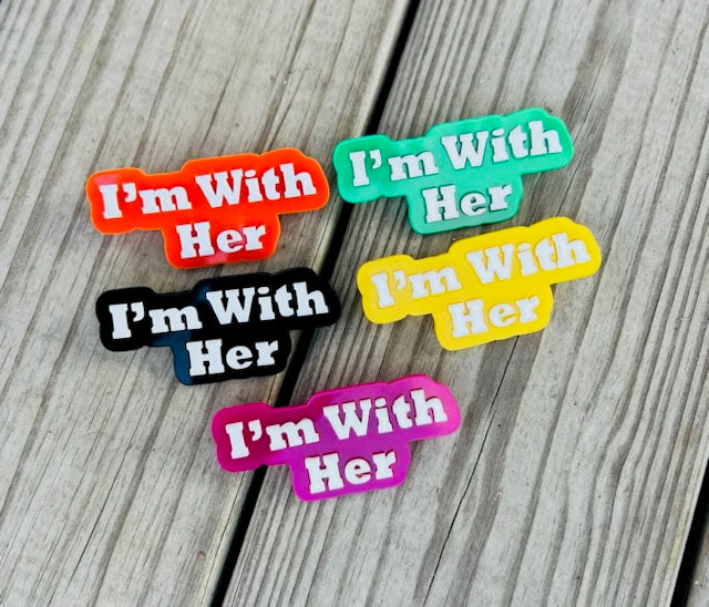 I'm With her Lapel Pin. Show your support for Madame Vice President Kamala Harris in her quest to become the first Female president of the United States of America. Choose the background color of the pin from the drop-down box. All wording will be in white letters.