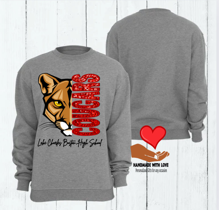Rep Your school on game night with these Cougars faux sequins/embroidery sweatshirts or t-shirts. Garments contain DTF Image.
