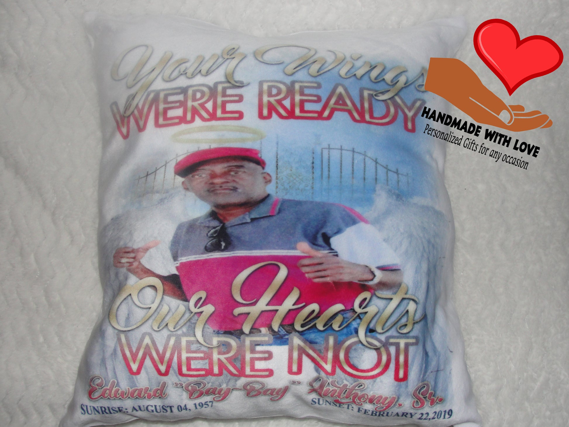 What a way to keep your loved ones near. 15" Square White Throw Memorial Pillow. Available in 3 styles: To my daughter, Gone but not forgotten with Bible and Purple God's garden design.
