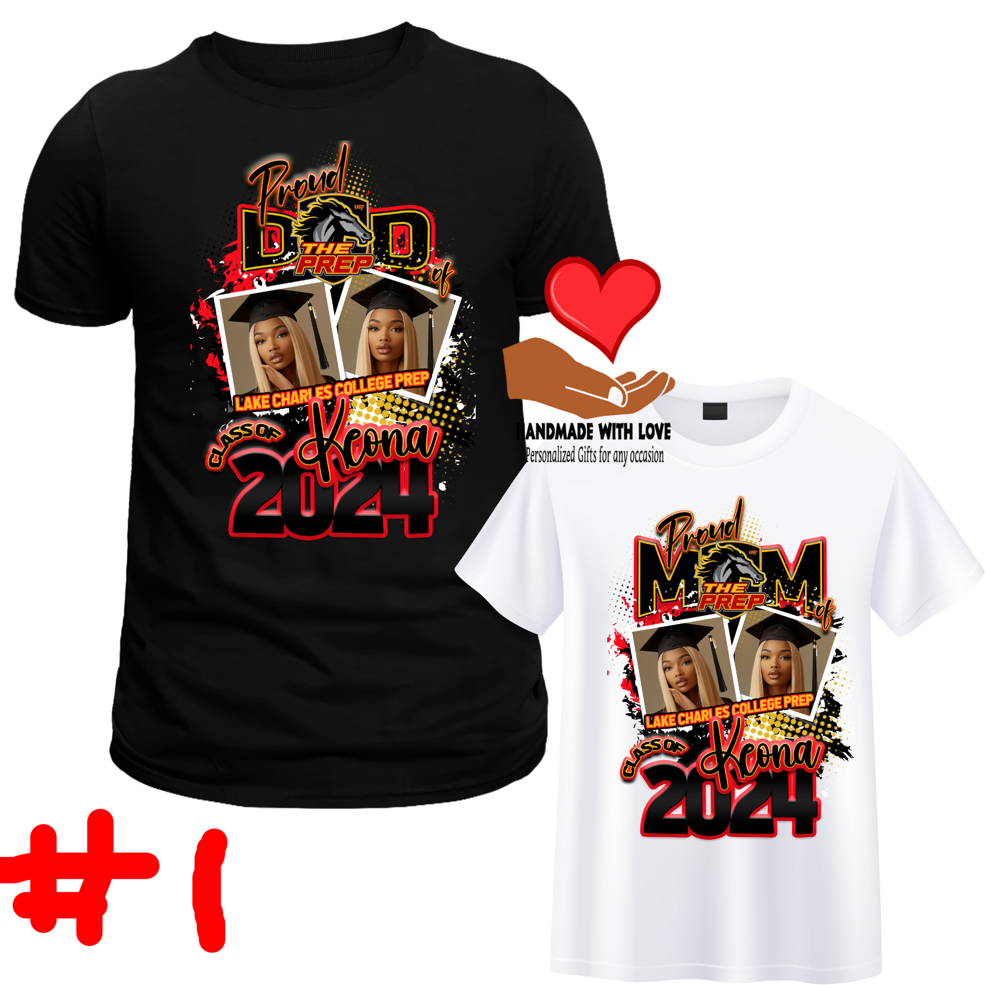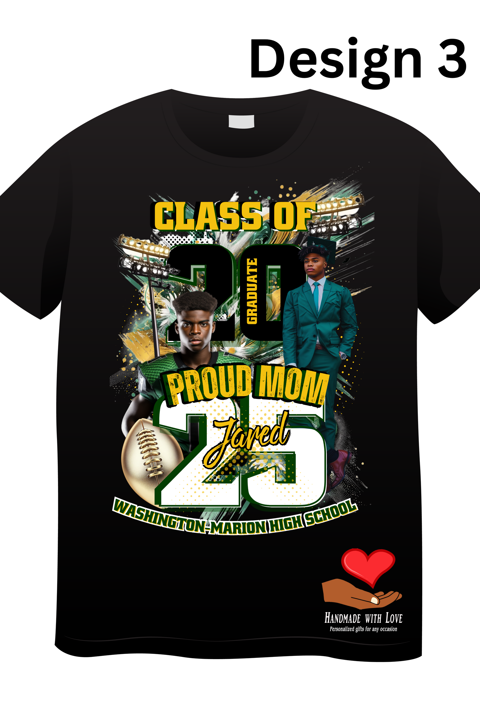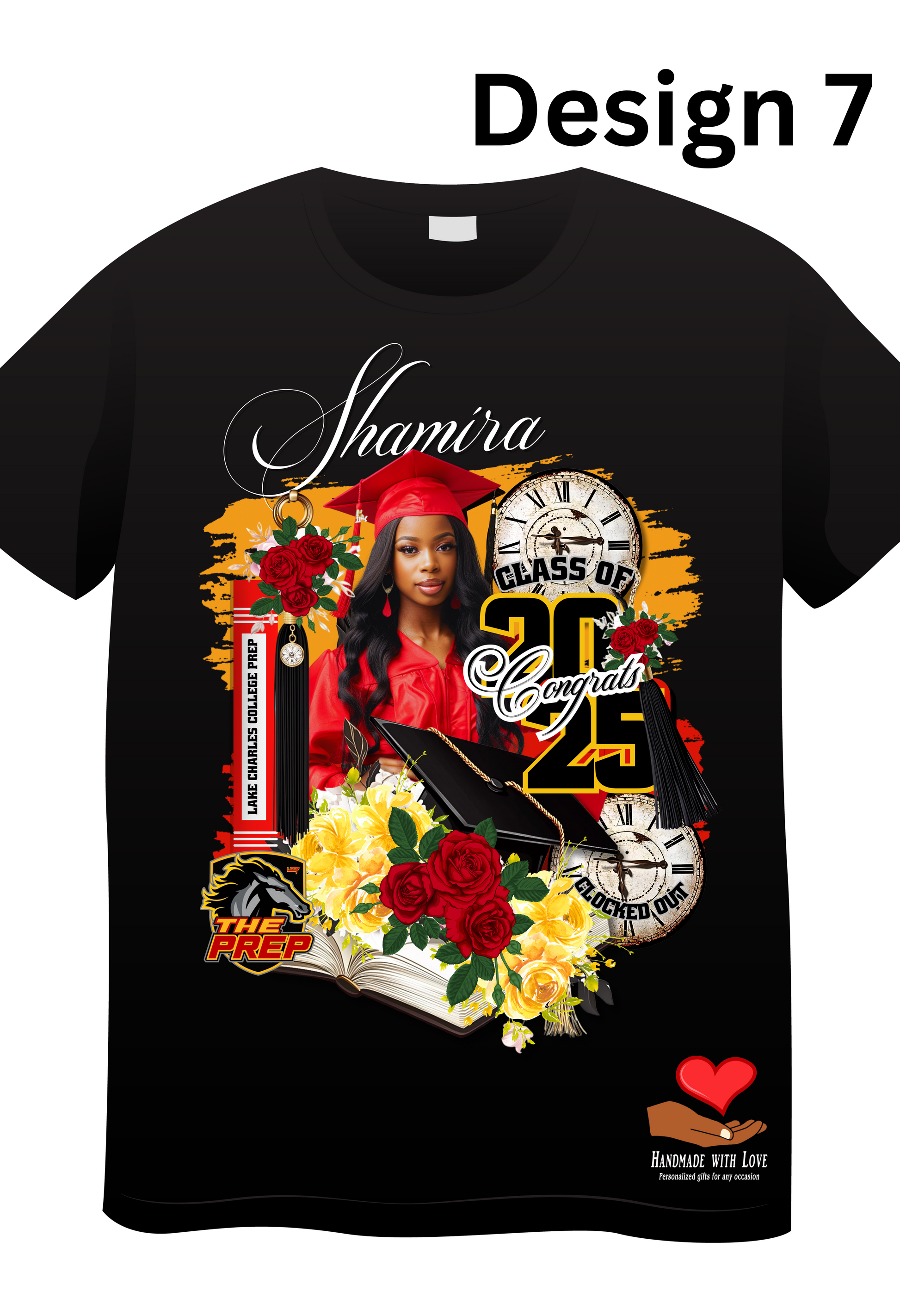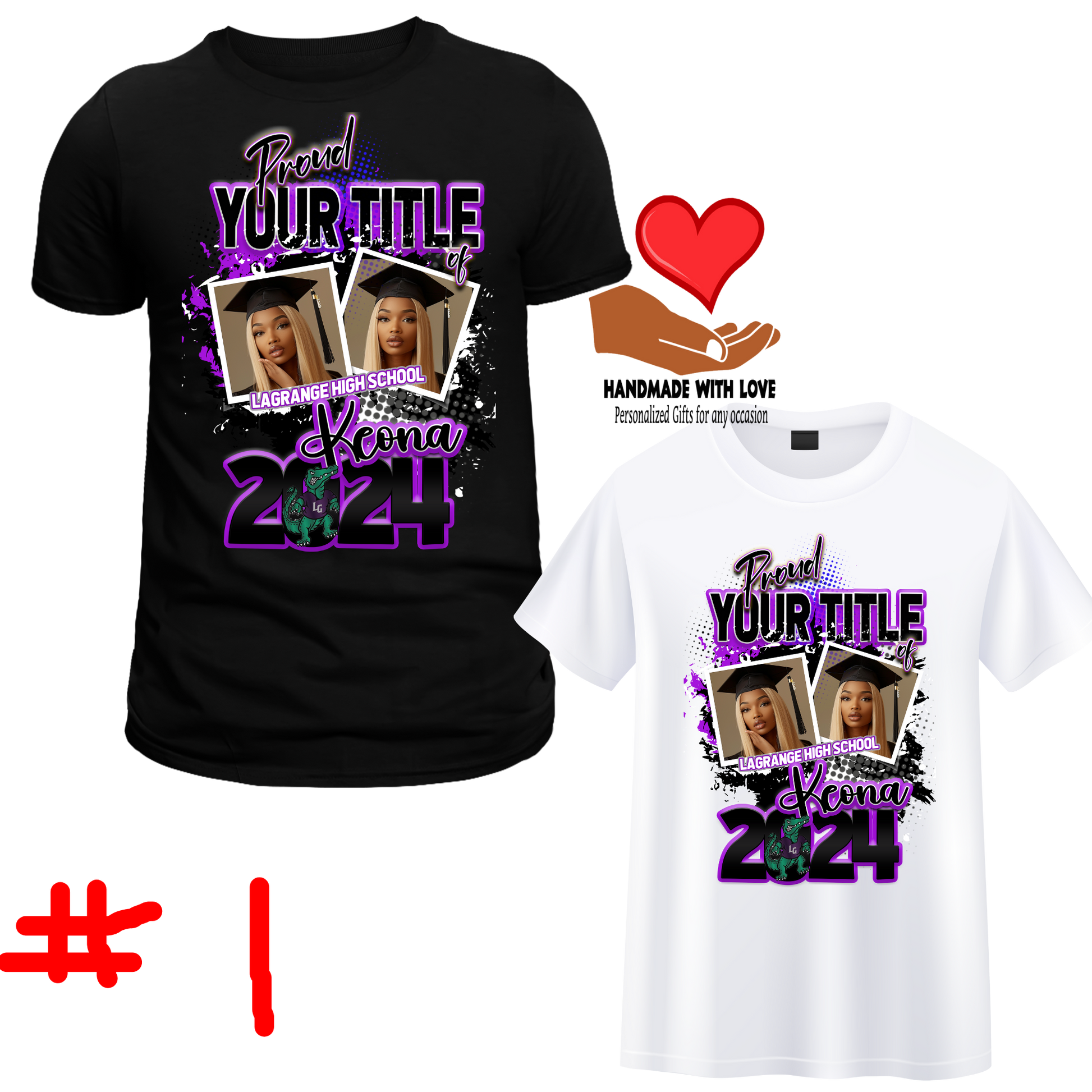 Custom Photo graduation shirts. All local high schools and colleges are available and if school is not shown, please feel free to provide us with your school color and mascot so that we can create a shirt for you. 2 week production time