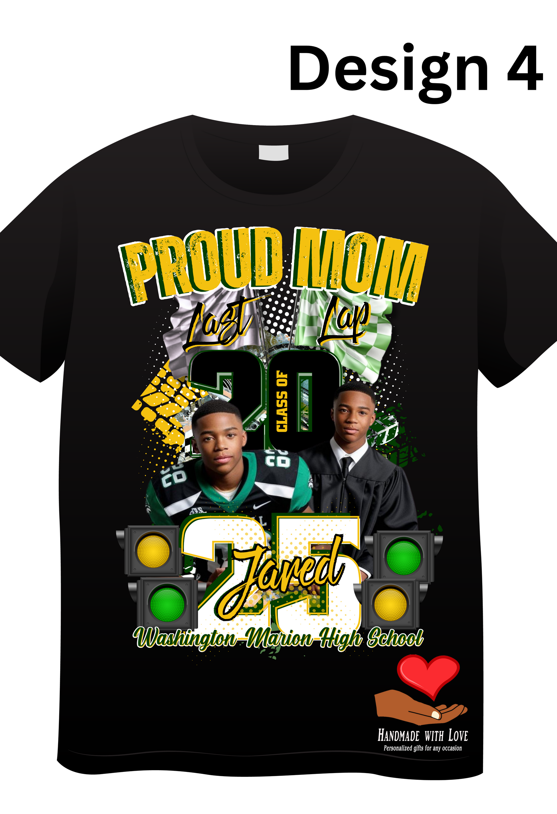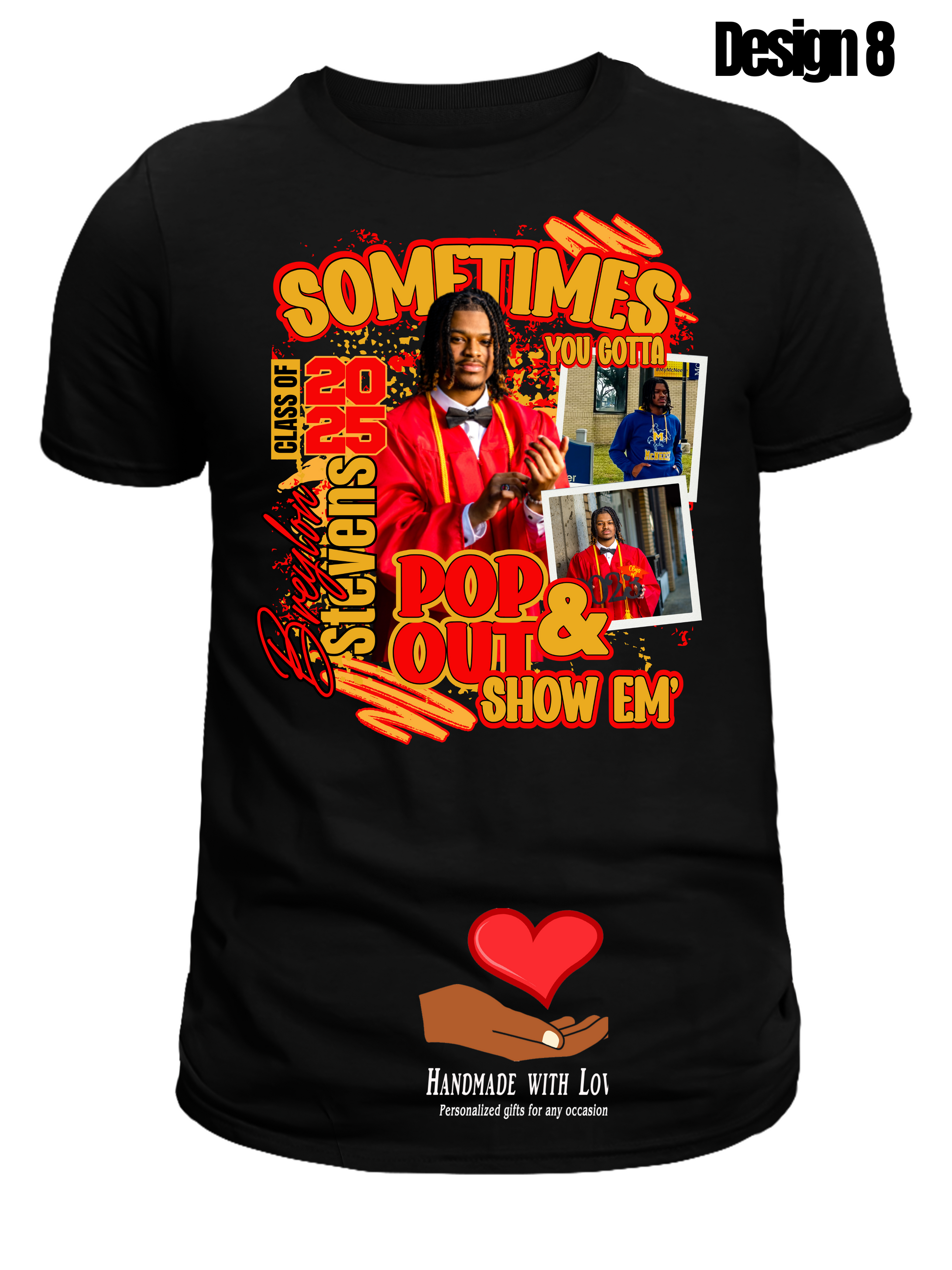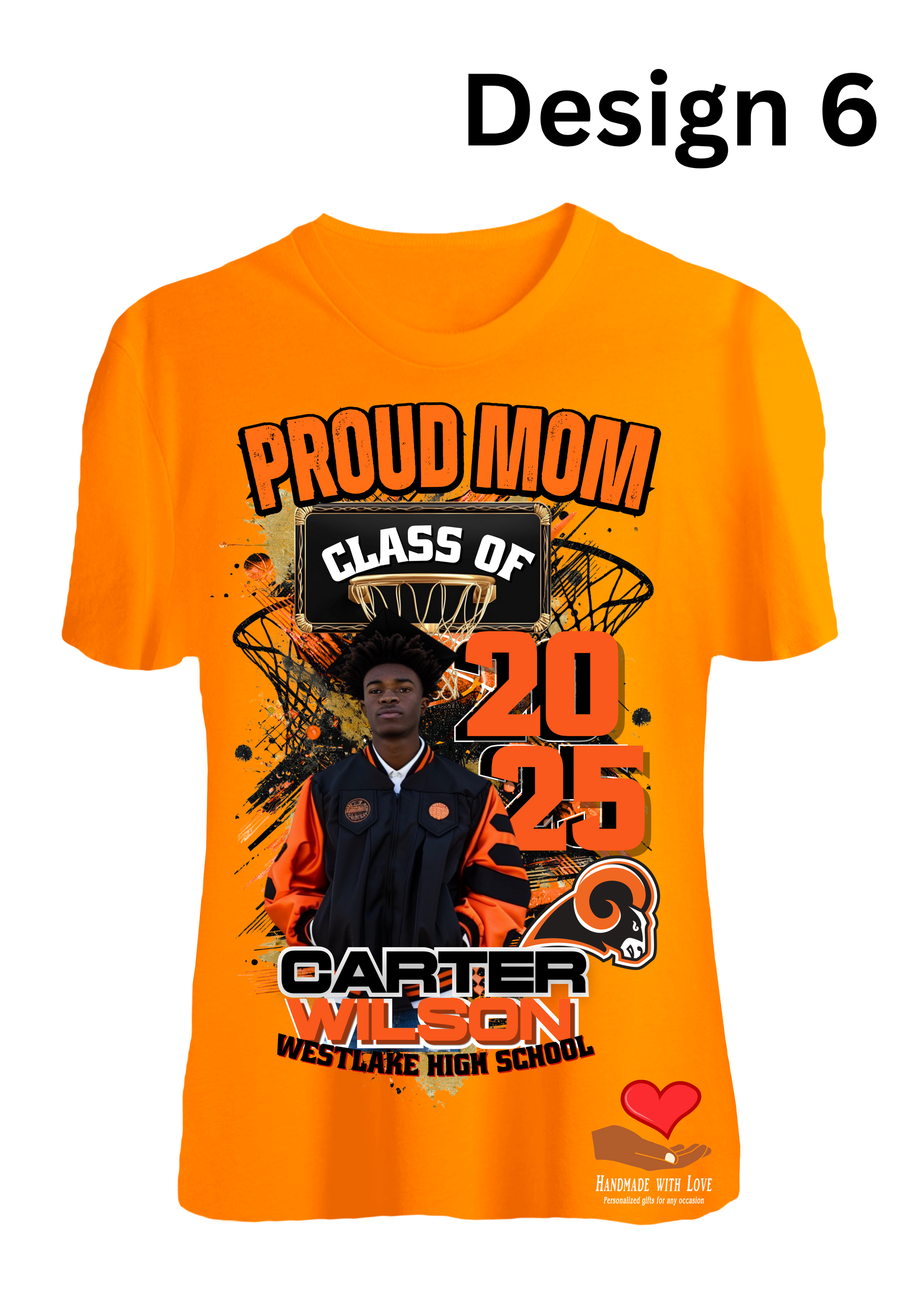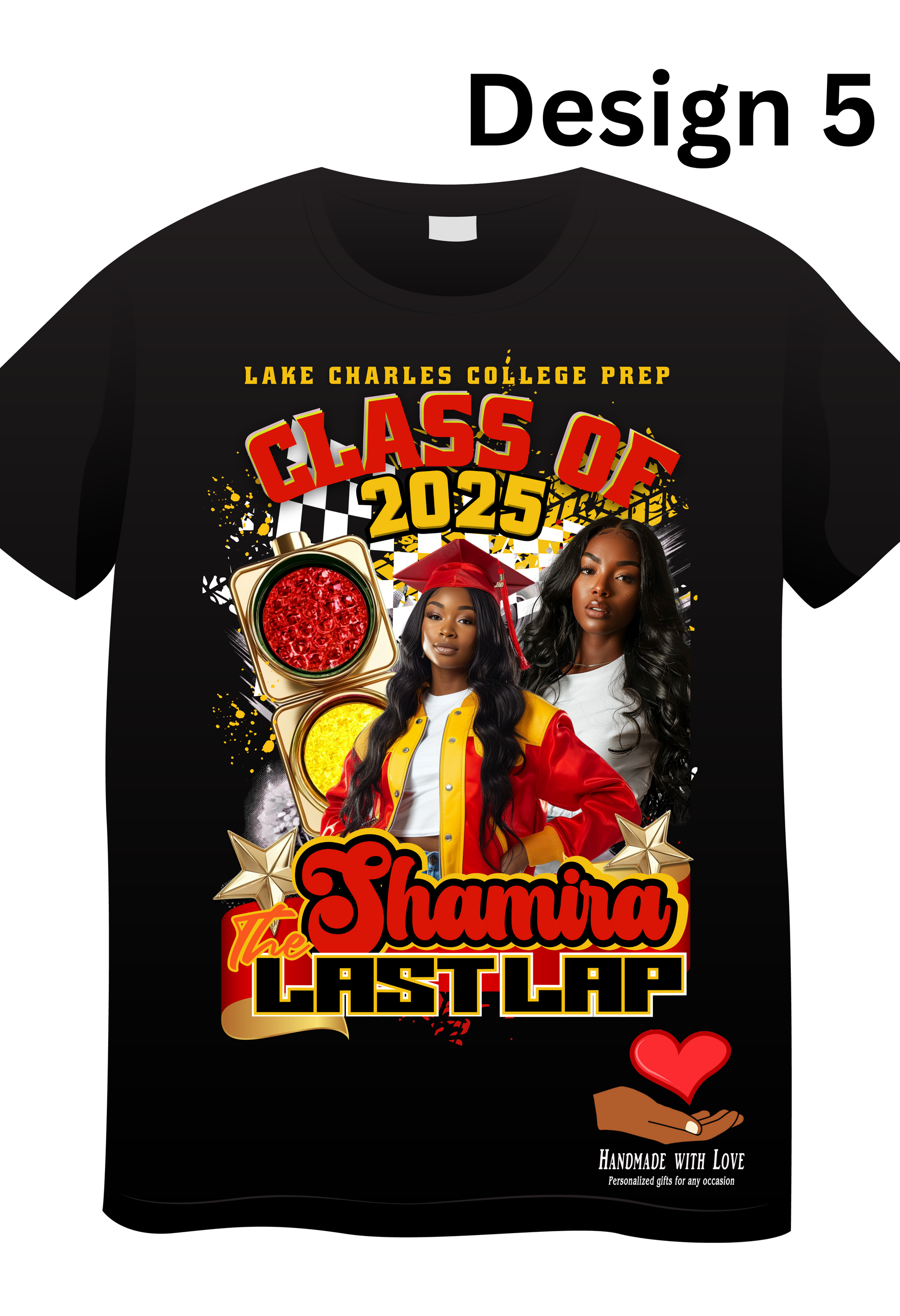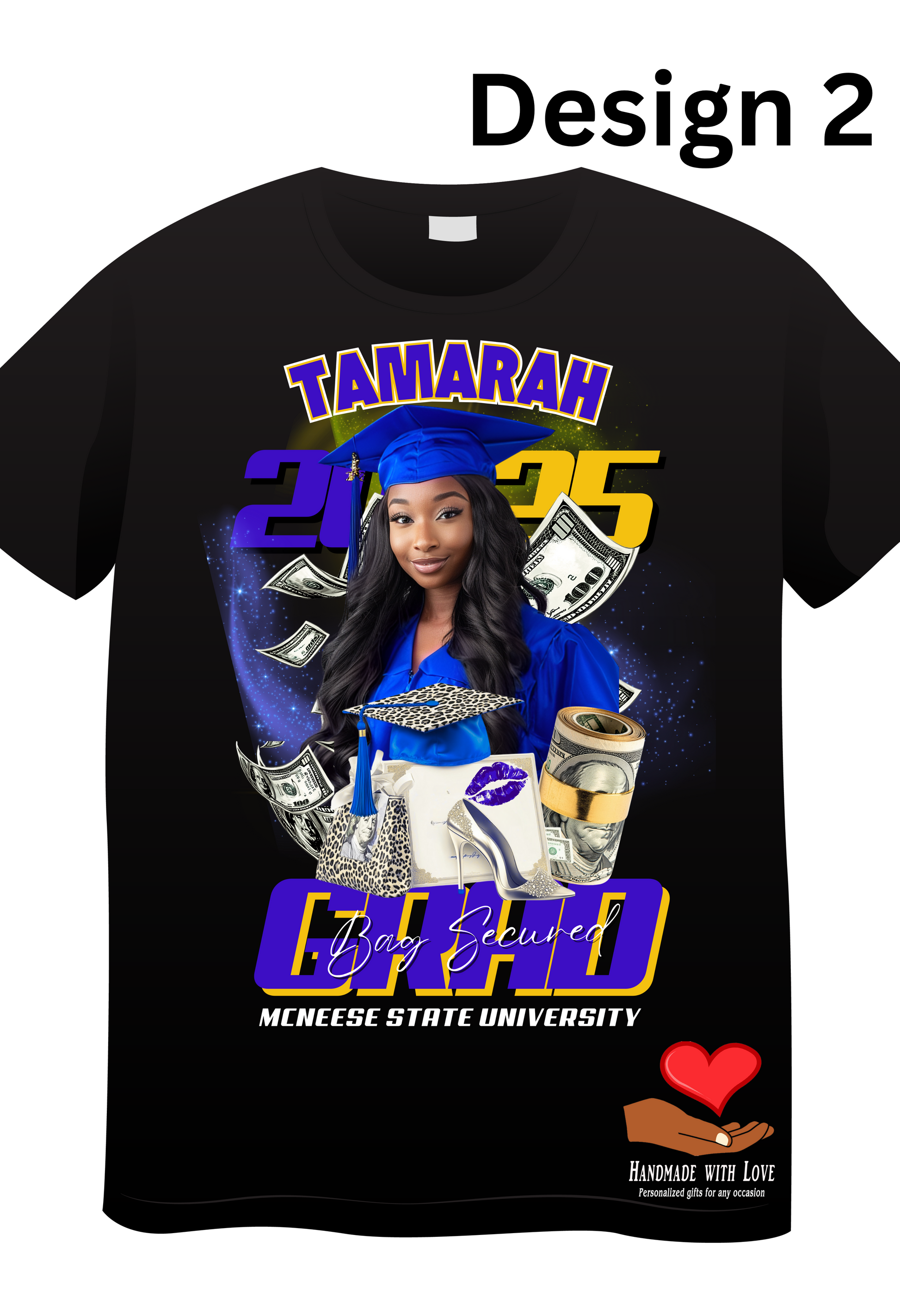 Custom Photo graduation shirts. All local high schools and colleges are available and if school is not shown, please feel free to provide us with your school color and mascot so that we can create a shirt for you. 2 week production time