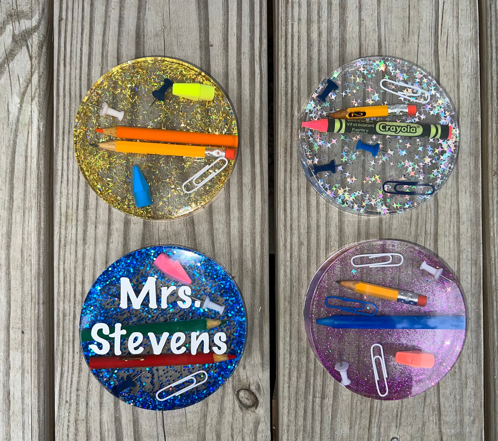 Each Resin Coaster Comes with One Pencil and One Crayon, Eraser, Pushpin’s, Paper clips.